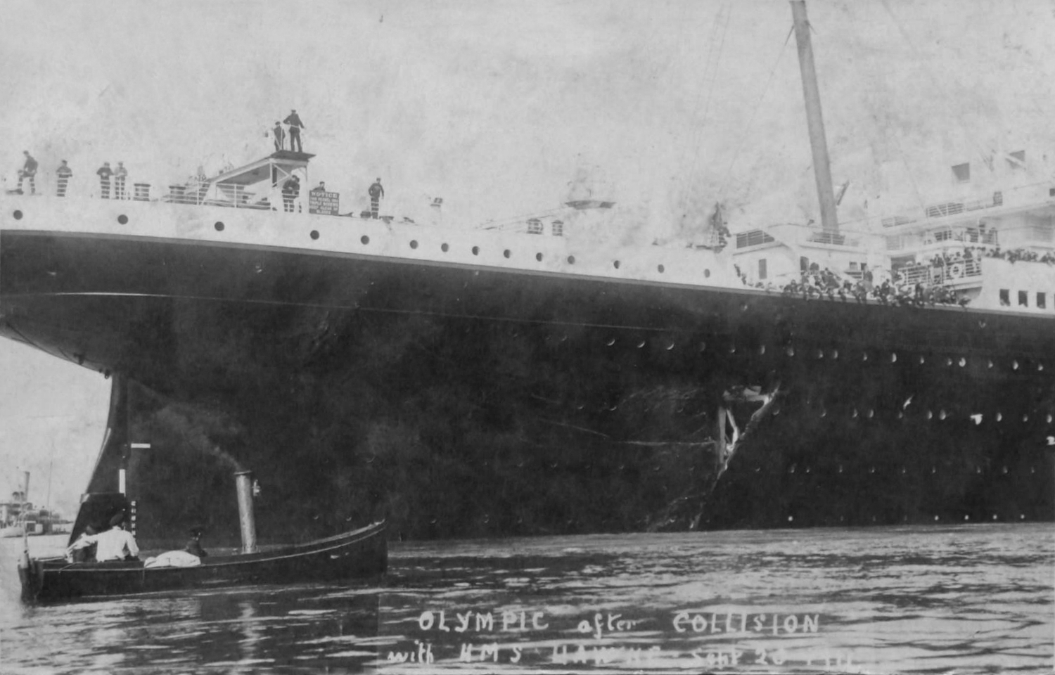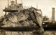 Le 20 septembre 1911, l'Olympic entame sa cinquième traversée au départ de Southampton. Le départ est mouvementé puisque certains chauffeurs refusent d'embarquer à cause de la présence à bord de deux chauffeurs non syndiqués. Lorsque le navire part enfin, il voit s'approcher dangereusement de lui un navire de guerre britannique, le croiseur HMS Hawke. Le croiseur, conçu pour éperonner d'autres navires, heurte la poupe de l'Olympic avec sa propre étrave qui est littéralement écrasée sous le choc. Certains témoins disent alors que le capitaine du croiseur, George William Bowyer, dirigeait imprudemment son navire ; les autres que l’Olympic a aspiré le HMS Hawke. Durant l’incident se trouvent à bord deux membres d’équipage, Violet Jessop et Arthur John Priest qui, tous deux, survivent également par la suite aux naufrages du Titanic et du Britannic. La traversée est annulée à cause de la collision. Les passagers sont conduits en train jusqu'à Londres, et certains parviennent à rejoindre Liverpool pour embarquer sur l’Adriatic.