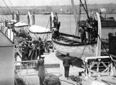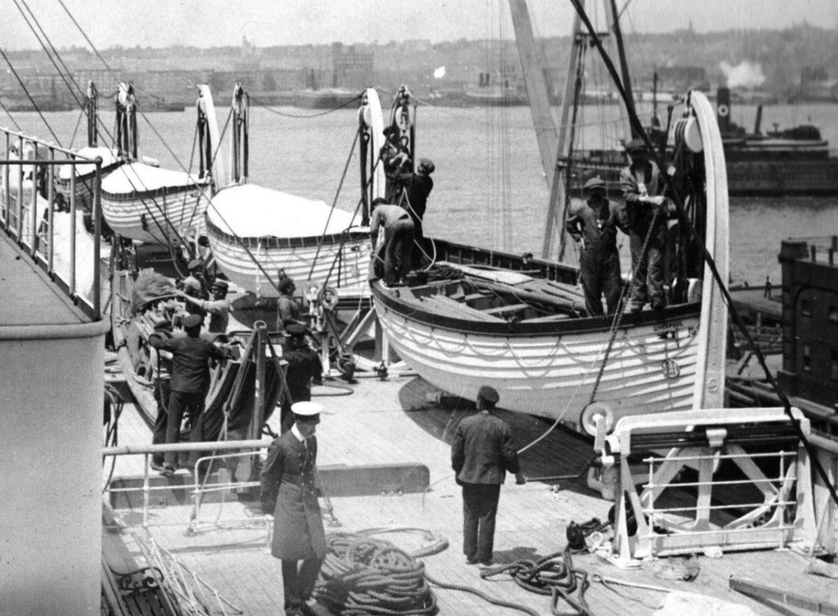 | La commission d'enquête dirigée par le sénateur William Alden Smith, examine le fonctionnement des bossoirs pour la mise à l'eau d'un canot de sauvetage de l'Olympic afin de mieux comprendre le naufrage du Titanic. |