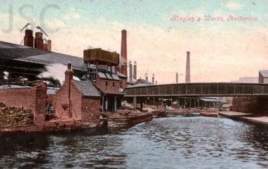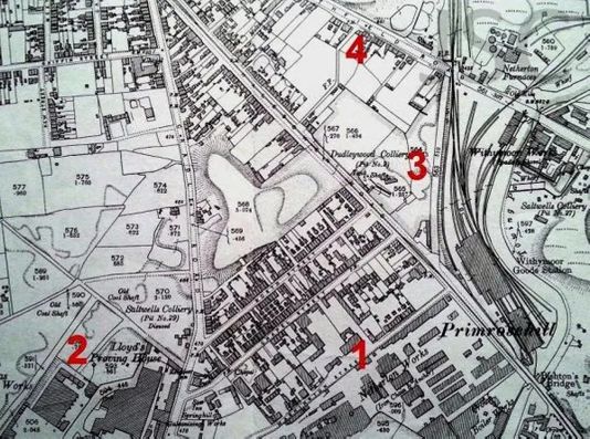 | (1) Noah Hingley's Netherton Works (2) Lloyds Proving House (3) The dirt track leading to Northfield Road (4) Northfield Road. |