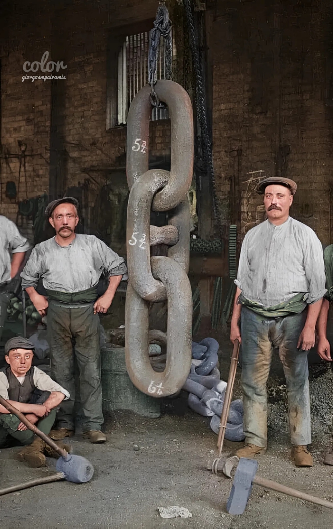 La fabrication de la tige d'ancrage a été un processus beaucoup plus intimidant. La tige devait d'abord être un énorme lingot d'acier massif formé à partir de petits blocs de barres de fer et compacté en une grande structure qui serait plus facile à travailler selon la taille. Chauffé à plus de 5000 degrés dans les fours, un marteau de forgeage à vapeur de 20 tonnes a été utilisé pour former la forme principale de la tige d'ancrage. Une équipe d'ouvriers, plus connue sous le nom de marteleurs, tournait en groupe la tige à l'aide d'un système de poulies à chaîne fixé à la structure du toit de l'atelier, faisant glisser la lourde tige d'avant en arrière dans le marteau de forgeage. Chaque fois que l'acier commençait à refroidir, la section était réchauffée dans le four et le processus était répété jusqu'à ce que la tige réponde aux exigences de la taille commandée. Le résultat final pour l'ancre centrale du Titanic était un objet de plus de quinze pieds de long et pesant près de 8 tonnes. Pour les oeillets situés aux deux extrémités de la tige, dans lesquels passent les goupilles de sécurité qui fixent la tête et la manille, les oeillets ont été tournés à la machine et nettoyés. |