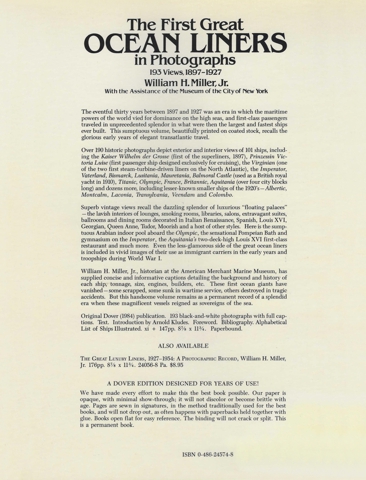 | Sumptuous volume recalls the glorious early years of elegant transatlantic travel. Over 190 historic photographs depict exterior and interior views of 101 great ocean liners, including the Virginian, Imperator, Vaterland, Bismarck, Lusitania, Mauretania, Balmoral Castle, Titanic, Olympic, Aquitania and dozens more. Full captions. "...the collection of interior pictures is worth the modest price of the book. |