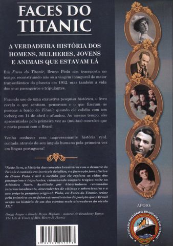 | Em "Faces do Titanic", Bruno Piola nos transporta no tempo, reconstruindo não só a viagem inaugural do maior transatlântico do planeta em 1912, mas também a vida de seus passageiros e tripulantes. Fazendo uso de uma exaustiva pesquisa histórica, o livro revela o que sentiam, pensavam o que fizeram as pessoas a bordo do Titanic quando ele colidiu com um iceberg em 14 de abril e afundou. Ao mesmo tempo, são apresentadas pela primeira vez as (muitas) conexões que o navio possui com o Brasil. |