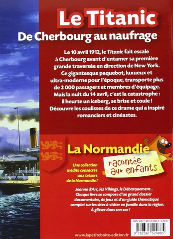 | Le 10 avril 1912, le Titanic fait escale à Cherbourg avant d'entamer sa première grande traversée en direction de New York. Ce gigantesque paquebot, luxueux et ultra-moderne pour l'époque, transporte plus de 2 000 passagers et membres d'équipage. Mais la nuit du 14 avril, c'est la catastrophe : il heurte un iceberg, se brise et coule ! Découvre les coulisses de ce drame qui a inspiré romanciers et cinéastes. |