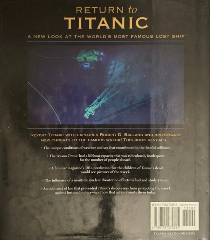 Ballard documents what has become of the world's best-known ship, torn apart by salvagers over the last 2 decades, and pronounces a new and vital conservation ethos - that future such wrecks must be preserved as historical monuments.