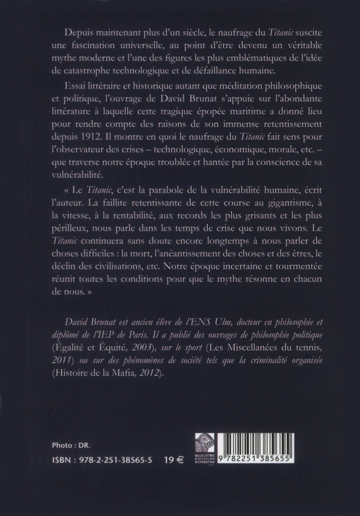 Essai littéraire et historique autant que méditation philosophique et politique, l’ouvrage de David Brunat s’appuie sur l’abondante littérature à laquelle cette tragique épopée maritime a donné lieu pour rendre compte des raisons de son immense retentissement depuis 1912. Il montre en quoi le naufrage du Titanic fait sens pour l’observateur des crises – technologique, économique, morale, etc. – que traverse notre époque troublée et hantée par la conscience de sa vulnérabilité. « Le Titanic, c’est la parabole de la vulnérabilité humaine, écrit l'auteur. La faillite retentissante de cette course au gigantisme, à la vitesse, à la rentabilité, aux records les plus grisants et les plus périlleux, nous parle dans les temps de crise que nous vivons. Le Titanic continuera sans doute encore longtemps à nous parler de choses difficiles : la mort, l’anéantissement des choses et des êtres, le déclin des civilisations, etc. Notre époque incertaine et tourmentée réunit toutes les conditions pour que le mythe résonne en chacun de nous. » |