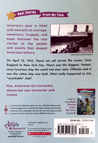 Discover the stories of the real people and events that shaped American history in the Real Stories From My Time series. Perfect for book reports with full-page illustrations throughout, these nonfiction chapter books also include historical photos, maps, a timeline, a glossary, and a bibliography at the back. Plus, in each book, an American Girl historical character shares a bit of her own fictional story. Titanic includes real life stories of the passengers who were aboard the supposedly unsinkable ship-from everyday life on board to the night of the infamous iceberg collision. American Girl Samantha Parkington shares her own story of traveling across the ocean as a first class passenger on a steamship in the early 1900s. |